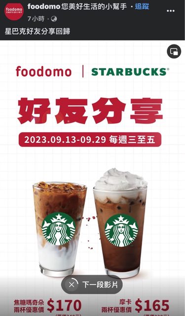 星巴克好友分享 2023/09/13-2023/09/19 每週三至五 特大杯 焦糖瑪奇朵 兩杯優惠170元 (原價340元) 特大杯 摩卡 兩杯優惠165元 (原價330元) --------------------------------------- 買一送一終於回歸了 之前兩杯6折真的沒什麼吸引力 如果消費滿199可以搭OPENPOINT 1點折2元 這家星巴克買一送一可以搭配優惠碼跟OPENPOINT折抵 應該是買星巴克最划算的app? -- ※ 發信站: 批踢踢實業坊(www.ptt-website.tw), 來自: 223.137.166.223 (臺灣) ※ 文章網址: https://www.ptt-website.tw/Lifeismoney/M.1694596294.A.7EB