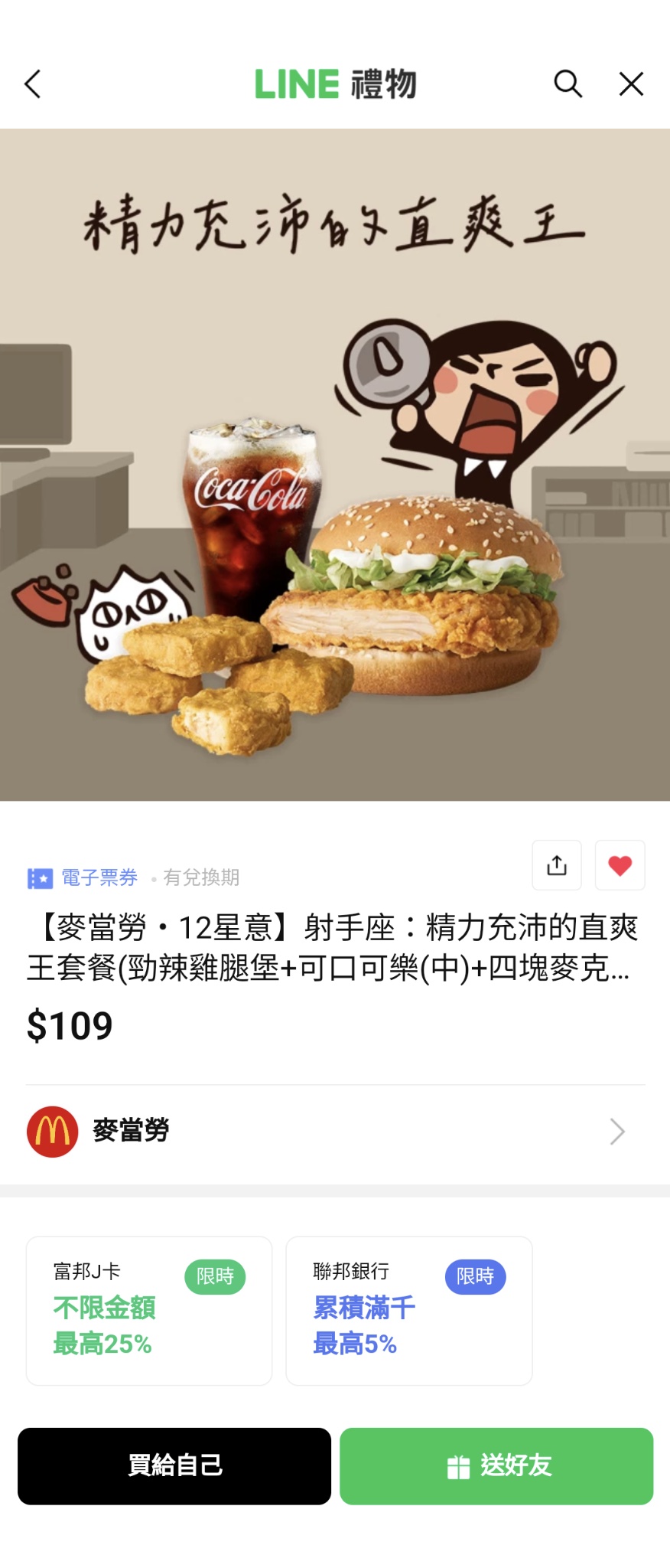 麥當勞超值全餐LINE限定優惠價 6塊麥克雞塊+小薯+中杯可樂 $99 10塊麥克雞塊+小薯+中杯可樂 $109 勁辣雞腿堡+小薯+中杯可樂 $109 大麥克+小薯+中杯可樂 $109 兌換期間9/27~10/3 兌換後一個月內有效 -- ※ 發信站: 批踢踢實業坊(www.ptt-website.tw), 來自: 1.200.91.8 (臺灣) ※ 文章網址: https://www.ptt-website.tw/Lifeismoney/M.1696227490.A.E99