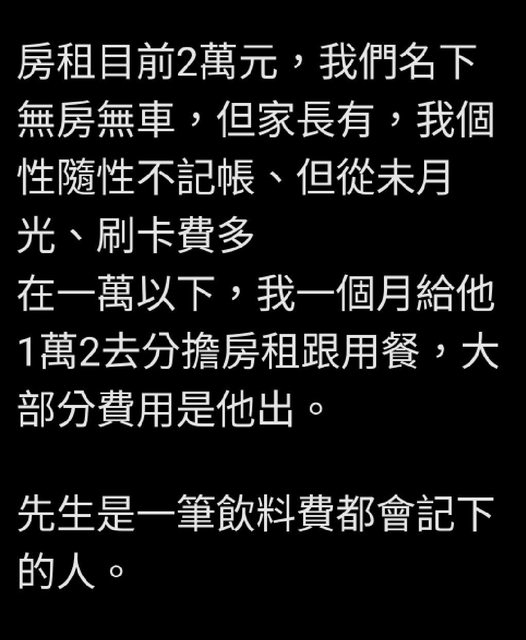 : : 房租目前2萬元,我們名下無房無車,但家長有,我個性隨性不記帳、但從未月光、刷