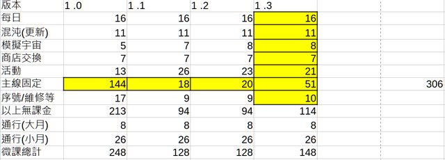 ║主線固定 ║ 144 ║ 18 ║ 20 ║ 51 ║ 306(1.3才加入無課最多可得)