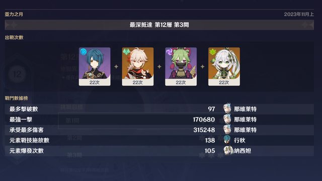 → gtfour: 我打須彌天賦本 隊伍把夜蘭換成芙芙後 宵宮e射一輪穩穩過 11/29 15:06