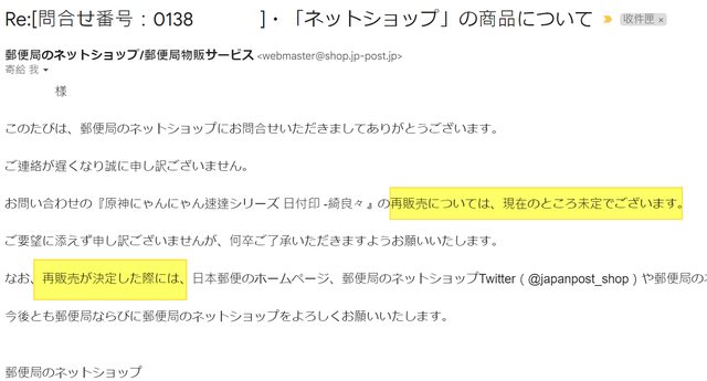 3. (更正)郵局限量的動漫畫周邊都會標註「賣完為止」,基於回信內容跟目前