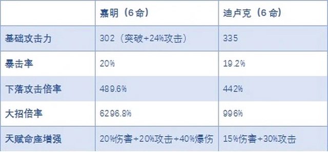 嘉明的下落攻擊倍率是由e傷害轉化而來,可以吃到三命的e+3,下落倍率是489%,反超了 五星的迪盧克 大招招喚出獅子有787倍率,後續還有協同攻擊,12秒內觸發8次,總倍率能到6296%這個 驚人的數字,這是以每下都是787的協同來算的,測試服現在沒有寫出協同的傷害,所以 默認都是787倍率 雖然是璃月人卻有自燒血機制,除了可以帶獵人套之外,還能配合留芙兩個大輔助 且本身是火系能最大化利用留雲的下落倍率,打出蒸發 抗打斷方面帶個行秋雙水充能 雖然目前都在說留雲是魈的售後,但如果是留芙一起上,那麼火c下落傷害才是真的霸主 ,只可惜目前能下落的五星火c只有迪,四星的嘉明是目前最適配留芙體系的c 補一下完整技能 E是一個起跳 E下落414.7%,cd6秒,燒15%血,最低燒至10% Q 666.7%,持續12秒 cd15秒,60能量 Q期間如果在半血以上放E下落,可以再次觸發Q的這個傷害 E下落和Q都是火傷且都是獨立附著 都是10級技能,還沒算上 高於50%血時自帶20%增傷(不知道是否獨立乘區) 1命Q每次會和(一個Q的機制)回15%血 2命受到溢出治療時+20%攻 3命E+3 4命E下落命中時+2回能 5命Q+3 6命E下落+20%暴擊率+40%暴擊傷害,增加攻擊範圍 且e的時候抗打斷跟胡桃 心海同級別,帶一個行秋就能成霸體 -- ※ 發信站: 批踢踢實業坊(www.ptt-website.tw), 來自: 118.231.144.58 (臺灣) ※ 文章網址: https://www.ptt-website.tw/miHoYo/M.1703125761.A.F19