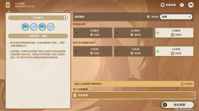 看到對面是兩種元素的史萊姆,很直覺地就覺得用風隊擴散是正解;而且看到對面史萊姆攻擊後會補血,得配一個冰系角色控制住第一隻水史萊姆,因此思路是組一個冰風牌組。剛好我原本的舊卡組中剛好就有冰風牌,就懶得用新卡重組了。