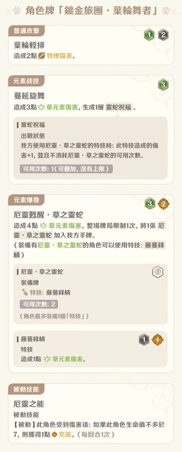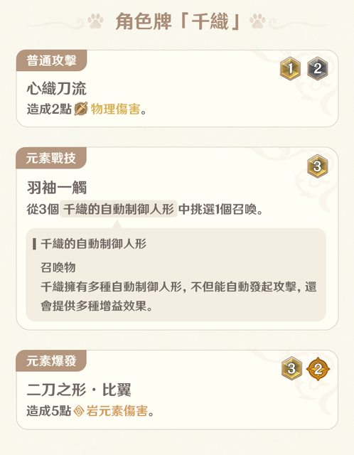 三選一召喚 沒辦法從這邊看出各種人偶的差別 但應該是攻擊時追擊、切人、下落攻擊相關的變化 鍍金旅團·葉輪舞者