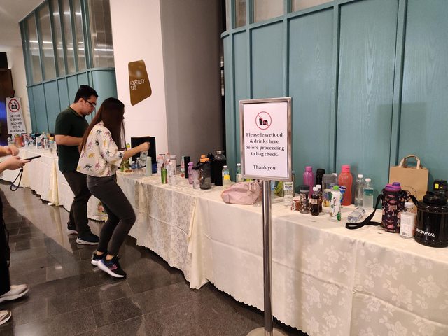 入場後要檢查包包,不可攜帶飲食,所以旁邊有個桌子給大家放自己的飲食品,想當然,我的水放上去後,出場後因為經過重新排序或者之後的人放置上去,我根本認不出來我的水在哪裡,所以直接不拿就走了...QQ