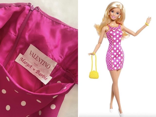 粉色波點中空洋裝 瑪格羅比於洛杉磯的電影發布會上,穿著一身Valentino為她訂製的粉色波點洋裝登場, 搭配Manolo Blahnik的高跟鞋和黃色包包,穿搭100%還原芭比娃娃。 裙子中空的設計很是性感,造型師Andrew Mukamal在社群上分享,這件裙子出自 Valentino過往的設計,只不過改以芭比招牌的亮粉色重新演繹,標籤上還有Margot X Barbie的字樣,特別可愛吧!瑪格羅比無違和的把芭比的風格帶進現實世界,不禁要懷疑 她整個人真的快要變成芭比了吧。 https://i.imgur.com/MbvZUIU.png