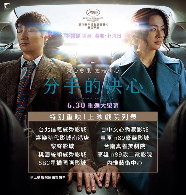 分手的決心》上映戲院列表 朴贊郁 榮獲坎城影展最佳導演獎! 6/30 (五) 重返大銀幕 隱藏真心的死者妻子 “去把他的心拿來給我” 有禮親切的刑警 湯唯 朴海日分手的決心》 6月30日(五)重返大銀幕 2022坎城影展最佳導演獎,獲本屆最高場刊分數3.2分! 2022釜日電影獎 最佳作品、最佳男主角、最佳女主角等五項大獎 2022韓國電影評論家協會獎 最佳作品、最佳導演、最佳女主角、最佳劇本等七項大獎 2022青龍電影獎 最佳作品、最佳導演、最佳男主角、最佳女主角等六項大獎 2022大鐘獎 最佳作品、最佳男主角、最佳劇本 2022釜山電影評論家協會獎 最佳男主角 2022加拿大多倫多國際影展 2022韓國釜山國際影展 2023亞洲電影大獎 最佳女主角、最佳劇本、最佳美術 韓國名導朴贊郁繼《下女的誘惑》睽違6年回歸大銀幕之作 《末日列車》《下女的誘惑》製作團隊最新力作 氣質影后 湯唯 青龍影帝 朴海日首度精彩共演,共譜懸疑禁忌之戀 朴贊郁再與《親切的金子》《下女的誘惑》 編劇丁瑞慶 共同執筆劇本,打造犯罪愛情作 《屍速列車:感染半島》李貞賢 《私生活》高庚杓 再展多變演技 資料來源:車庫娛樂 -- ※ 發信站: 批踢踢實業坊(www.ptt-website.tw), 來自: 49.216.235.103 (臺灣) ※ 文章網址: https://www.ptt-website.tw/movie/M.1687783747.A.CF2 ※ 編輯: godofsex (49.216.235.103 臺灣), 06/26/2023 20:50:04