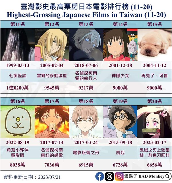 7/21壞猴子整理了台灣影史日本電影排行榜11-20名