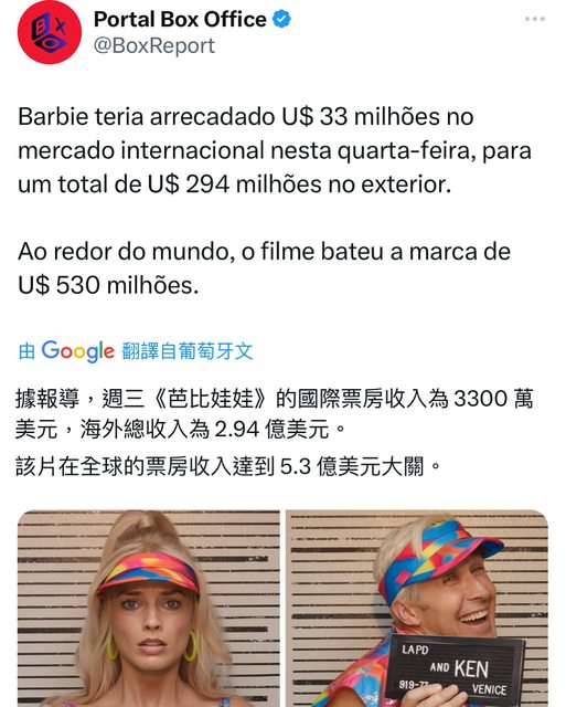 據報導,週三《芭比》的國際票房收入為3300萬美元,海外總收入為2.94 億美元。 該片在全球的票房收入達到5.3 億美元大關。 https://i.imgur.com/zDyIFSg.jpg