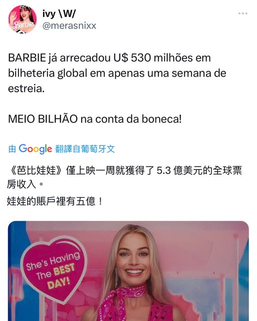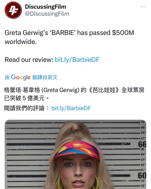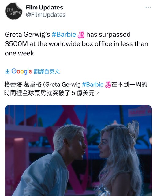 Greta Gerwig的《芭比》全球票房已突破5 億美元https://i.imgur.com/1UIJ8LX.jpg