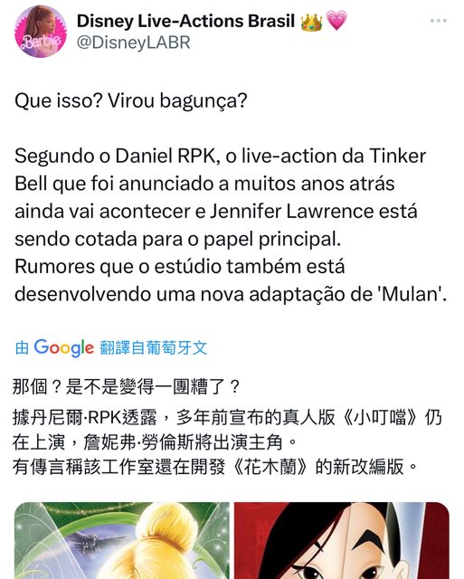 據丹尼爾 RPK透露,多年前宣布的真人版《小叮噹》仍在上演,珍妮佛 勞倫斯將出演主 角。 有傳言稱該工作室還在開發《花木蘭》的新改編版。 資料來源:推特 https://i.imgur.com/yz5YiNt.jpg