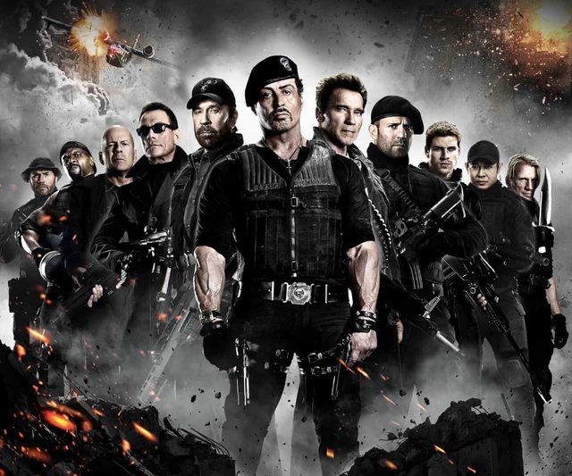就是集結各路在全盛時期王不見王的老牌動作英雄,包括阿諾、布魯斯威利、羅禮士、李