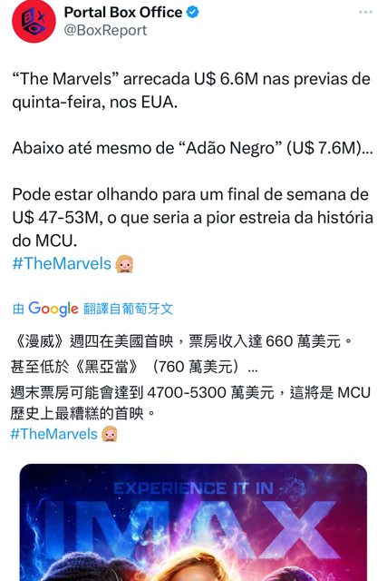 推 holyseraph : 再加上驚奇隊長2北美首周末也衝不高 真的完了 11/11 14:12