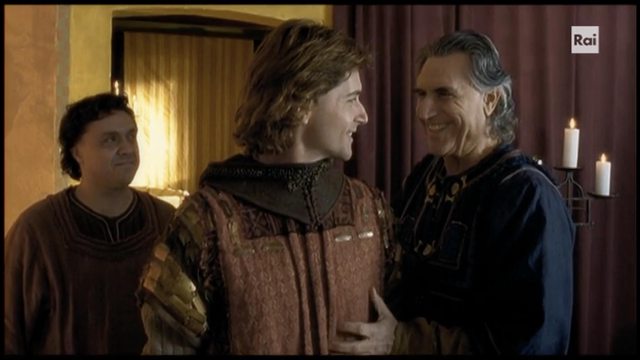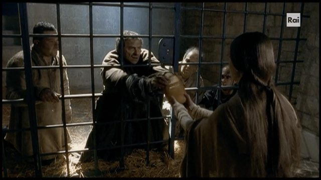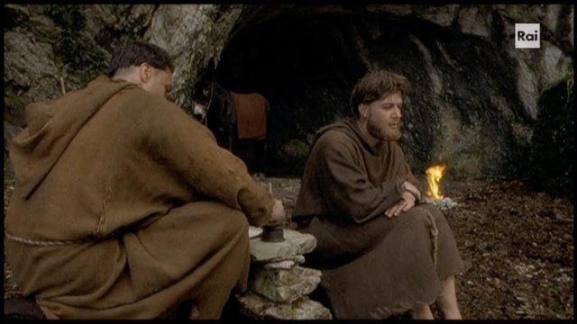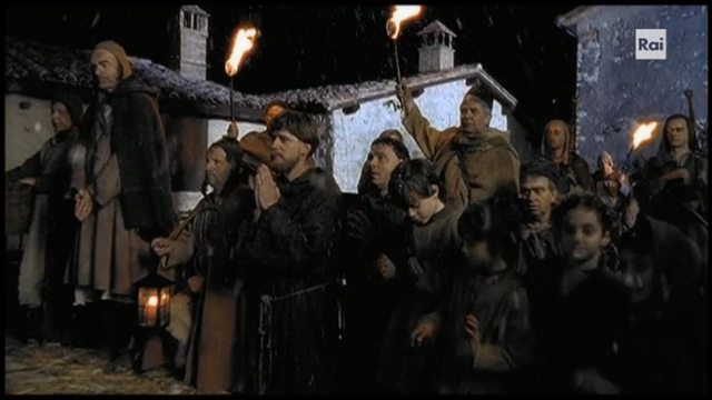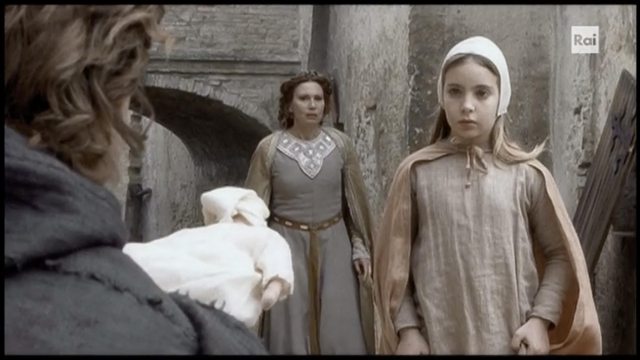 當然在這風格舒服就好故事完整才是重點的前提下,本片講述的 Francesco一生情節應是最完整,一方面他生平各大事件都連貫起來環環相扣構成每個抉擇的動機與思考,另一方面編劇也很努力讓 Chiara 在他人生很早階段就與他相遇留下印象醞釀默契,當然這其中應有許多 creative liberty 但也都有宗教史學家擔任顧問。至少相較於 2002 版大膽將兩人年齡拉平成為青梅竹馬 XD 這部 2007 版仍維持了兩人 13 歲差距,初次見面是一個青年遇見一個小女孩:第一場戲 1198 Assisi,Francesco 參與市民武裝革命意興風發喊打喊殺,要打要殺的貴族竟包含 Chiara 一家?