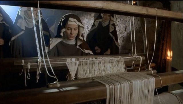 「祝你騎士之路馬到成功」、「祝妳婚姻之路早生貴子」,難道人的一生就在這些無謂功名中流俗汲營?十字軍真榮耀了什麼上帝旨意、而聯姻又實踐了什麼上帝之愛呢?本片把兩位聖徒角色對位處理,應算是給一個心靈領悟提出兩種現世框架:男女兩性人生路上都有各自一本難唸經、各自陷於俗世之道儘管時有猶豫但往往隨波逐流,但若有不同性別位置卻似曾相識的異性對方宛如鏡子與你相遇、彼此放在同一平台比較印證突然都清楚起來。「我生在富家不是當個領主就是去當個主教」、「我則不是當個夫人就是去當個女修道院長」,但一路成長上帝不都指過更純粹的路?