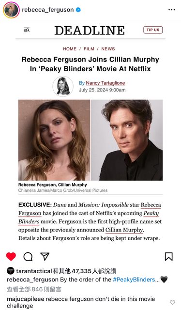 她在自己的IG宣佈加入浴血黑幫電影的卡司