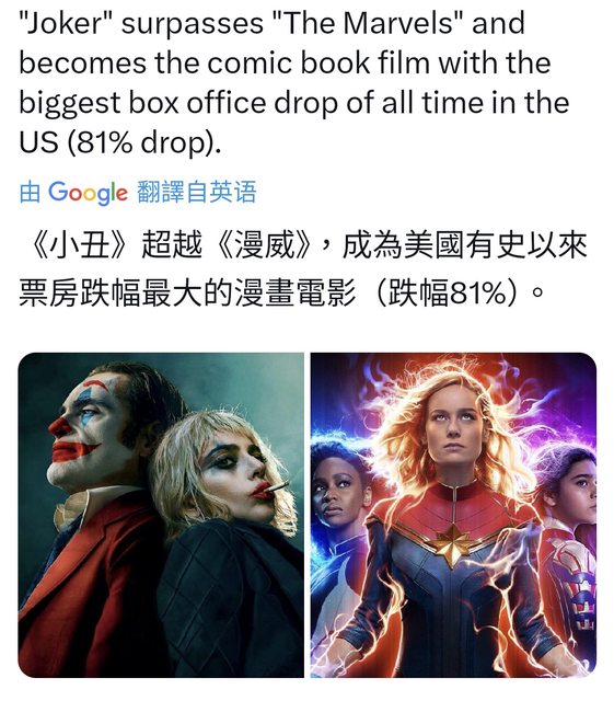 推 nwoyao : 驚奇隊長2沒有復仇者可以蹭,小丑2說自己不是DC小 10/14 16:04