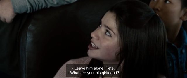 身為爸媽再看一次 Martha 教養的循循善誘、回視自己三天兩頭大呼小叫 XD 真不禁汗顏... 本片農夫 Jonathan 農婦 Martha 在鏡頭前都很有耐心與修養,比起我們高學歷都會中產才是真模範家長,當然他們背後多少日常摩擦衝突生氣 (?)那也毋須演給觀眾看... 然而裸男偷完衣服後 XD 下一場戲馬上接到這個年頭連老師都沒輒的「霸凌」:(3) 小克拉克不意外地遇上霸凌小胖 Pete Ross!他不敢吭聲反倒是鄰家女孩 Lana Lang發不平之鳴,孩子也不禁想起自小爸媽教導「不可以暴制暴」但每天仍有同儕霸凌侵門踏戶時,這個年頭反倒往往是女生更有底氣仗義直言呢...