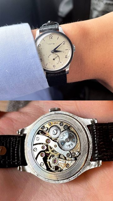 一只文到不行,而且殼型與打磨仍然保持原裝的小三針90歲古董錶。有氧化呈奶油色澤的面盤、厚重且光澤耀眼的藍鋼指針、更有32mm的小錶徑再加上打磨精美的機芯,其中導角打磨、砝碼擺輪、黃金套筒與三指夾板一樣不缺,再加上完美的上鏈手感與18000bph 的震頻,符合我對古董文錶的一切想像。