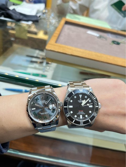 借用前幾日S大的開頭~ 我居然也有發文買到勞力士的一天~ 前段時間,有一筆可以支配的收入,跟弟弟討論使用分配後,很阿莎力地說:弟弟買給你 !感謝阿弟,姐姐愛你!!! 之後弟弟開始去看了幾家AD,一個月過去,沒消沒息,我想著,如果可以在2年後拿到當 做40歲生日禮物,我就該偷笑了! 前幾日的週日,在崛江剪完頭髮,AD就在不遠處,女友說,去看看啊,搞不好有展示的可 以上手確認是不是真的喜歡,想想也對,這隻一直只看過照片,從沒見過本尊,搞不好沒 那麼喜歡呢?(根本想太多怎麼可能不愛啦) 開門進去,一個親切的小姐接待,上手了36有坑紋的DJ,嗯,大小可以,但還是不知道灰 綠羅到底如何,也趁機再看看我跟弟弟都蠻有興趣的bb54。東聊西聊,突然小姐給了一道 曙光:如果bb54膠帶可以接受,或許、可能、有機會36灰綠羅坑紋三版帶下週會有貨喔! 出了錶店立刻傳訊息給弟弟,bb54他要嗎?還是有沒有更喜歡哪一隻我來問問,弟弟更想 要Pelagos 39,隔日,等錶店營業後打電話去騷擾小姐,最近會有pelagos 39嗎?小姐聽 了說:啊,這隻最近很紅欸,好幾個客人在問啊,週三到貨,好像、可能也會有喔! 如 果有的話會通知我! 我心花怒放啊啊!立刻設定鬧鐘,週三下午四點打電話去問!(不過哪需要設鬧鐘,時間 根本都刻在腦袋啊) 時間來到了週三下午,有一個市話來電,我迅速接起(平常我是不接電話的),是小姐啊 啊啊!真的打來通知我,兩隻都到店裡了!!!立刻約定7點賞錶! 灰綠羅真的好美好美喔喔喔~pelagos也是好好看~ 沒有猶豫,直接告訴小姐,我們要了!因為有一些考量,約定今天把錶帶回家! https://i.imgur.com/U1cbhvY.jpg