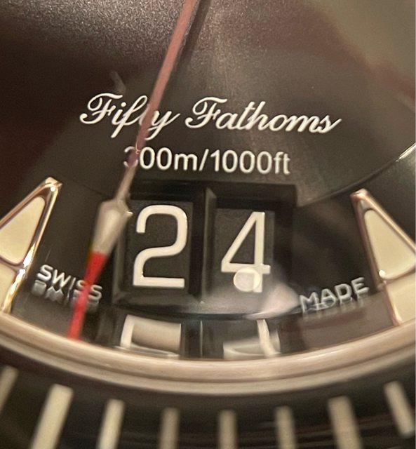 做為對照,Blancpain 五十噚的大日期(日期盤疊層左上右下,中間需有框條遮醜。個人