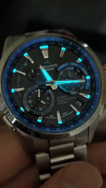 合電波的手錶,錶盤配置活潑,大小不一的三眼,就像海中氣泡一樣,夜光跟靛藍如同深