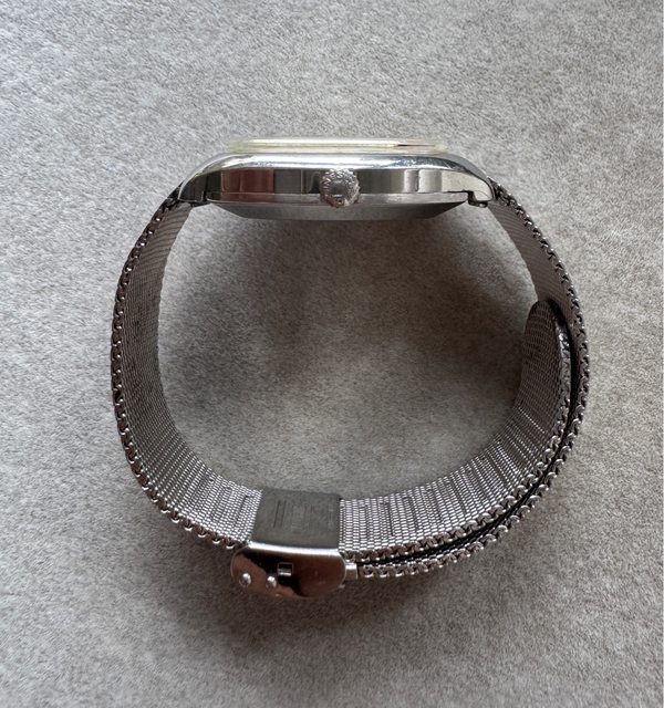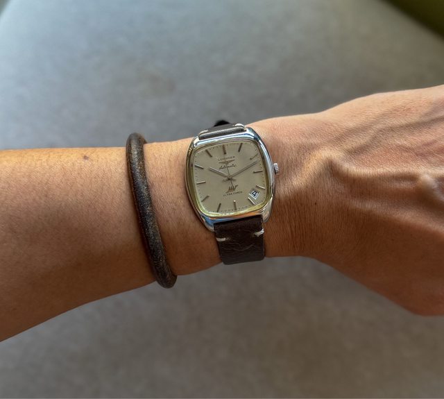 3. 老浪琴Ultra Chron電視機,約1970左右生產,431機芯 36000高振頻版本,日期瞬跳 ,自動手動上鏈機芯,漂亮銀灰色直紋面盤,原廠鏈帶約可以到19cm手圍),老鏈帶的設 計很貼身舒適~走時功能正常,全原裝漂亮品項,再付一條副廠皮錶帶供更換,售13500 含運~