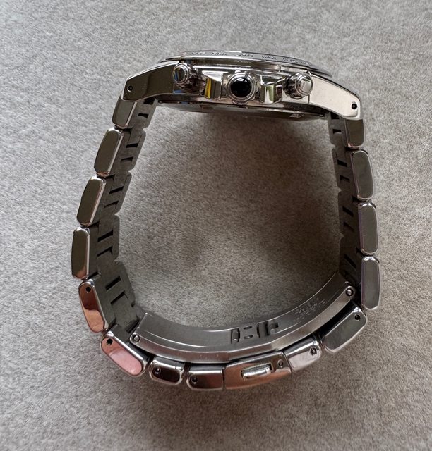 典雅,有種允文允武的感覺,搭配原廠鏈帶(約可到18.5cm),有錶盒及說明書,算是低