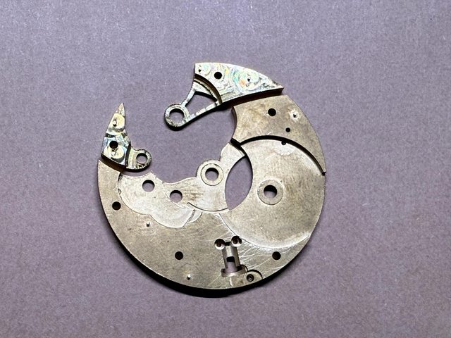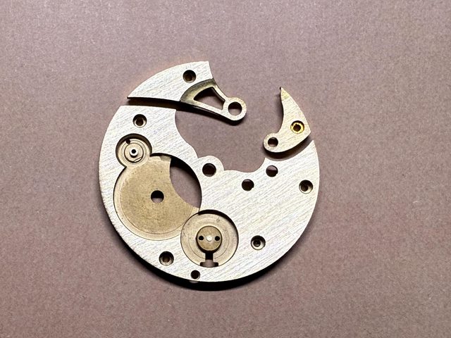 首先便是先複製一份6498機芯的主板和橋板進行測試,以確保寶石和輪系的精準定位,如果有任何偏差都會導致後續的失效,因此我們來回做了多個版本以確保在基礎結構上的可靠性 (這邊真的做了很多個版本) ,而後續的自行設計也會建立在這些構造之下來延伸。在完成自製橋板在原先6498主板上的測試之後,我們也成功地完成了在自製的主板和橋板上安裝6498的所有輪系和擒縱系統的測試,大家可以過程中看到黃銅板材隨時間氧化變色的情況。