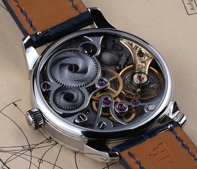 時候我們想要自己做手錶,我在吸收獨立製錶的知識的時候也不斷的被那些精細的倒角和拋光所吸引,撇開知名的大師們的先不談,當時我第一次和他真的討論大膽想法的時候是我看到Daniel Malchert的手錶之時,如同大家所看到的,他用nomos的機芯最為基礎,似乎並沒有做什麼結構和功能上的改動,只是純粹把邊緣做出細膩的倒角,搭配夾板的霜金處理之後便得到了這個美不勝收的作品,當時我手上剛好也有一支nomos Orion,於是我們便有了第一次對於大膽想法的討論,我也想把我的nomos變成這樣