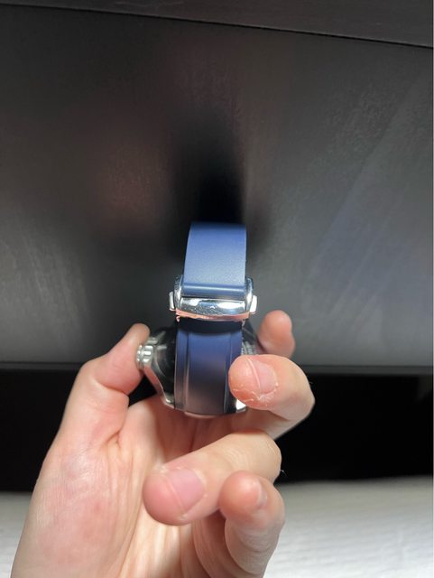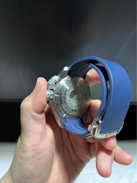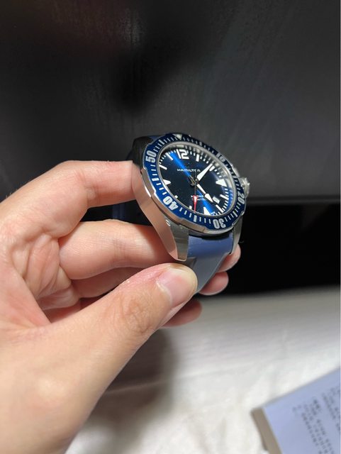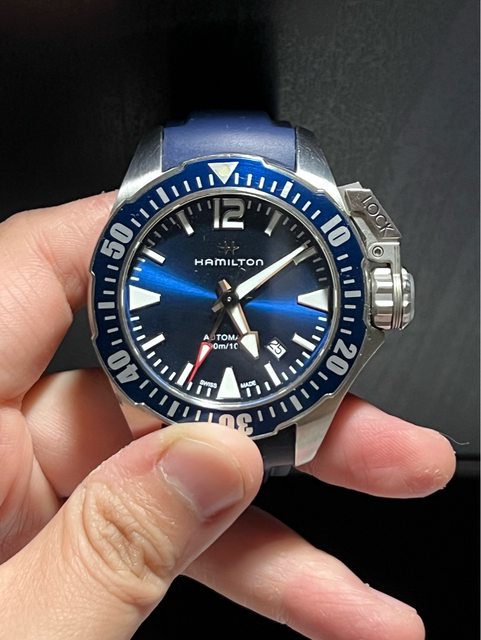 漢米爾頓蛙人藍色42mm,盒子保卡都有,目前裝的是副廠膠帶,原廠鋼帶都在,錶耳有撞